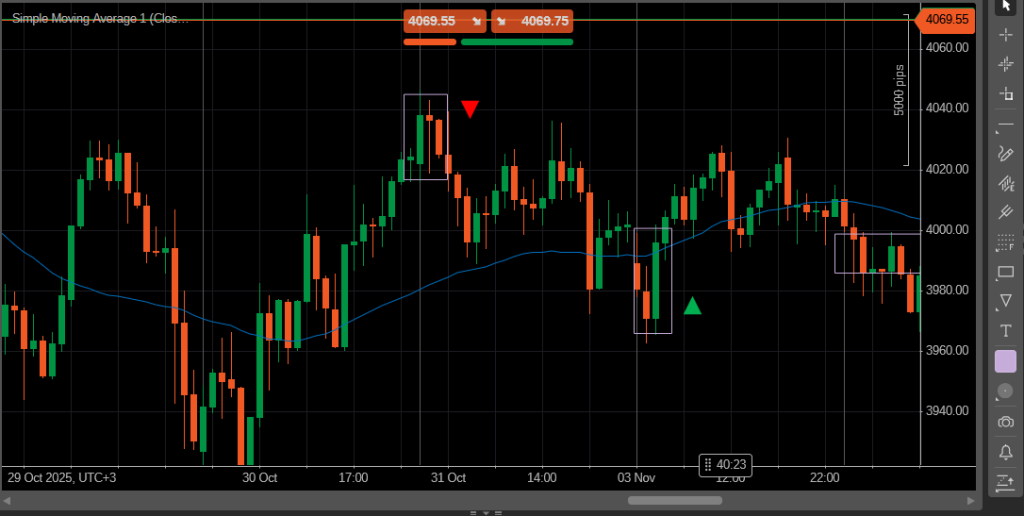 Gold falls to a major support level near 3980 after a pullback during low-volume Asian trading. A strong bullish rejection candle forms, signaling renewed demand. The trader enters a long position at 3992, sets a stop at 3978, and targets 4035. As US session liquidity enters and buyers push the market higher, gold rallies toward resistance, hits 4035, and the long position closes with a profit.