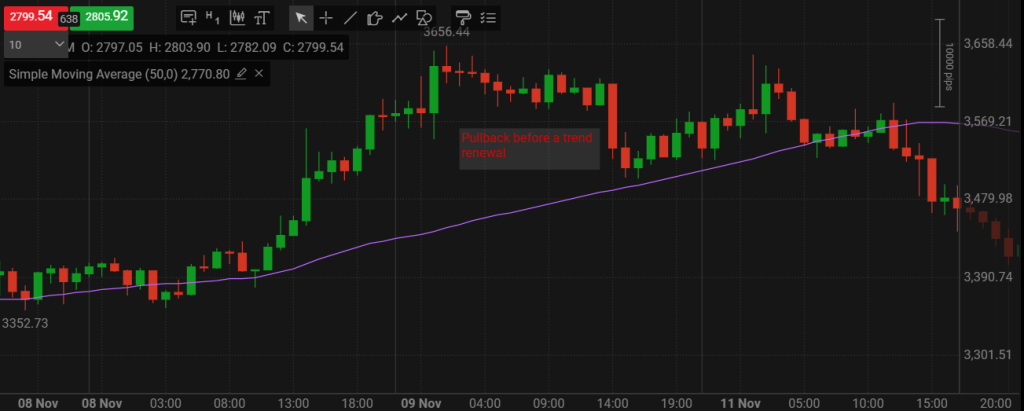 A pullback is a temporary move against the prevailing trend. It represents a short-term correction before the price resumes its main directional movement.